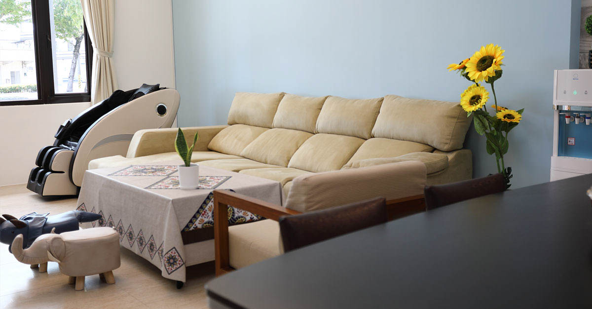 一進入民宿內部就能看到寬敞明亮的客廳,溫馨舒適的裝潢風格彷彿回到家一樣的自在,